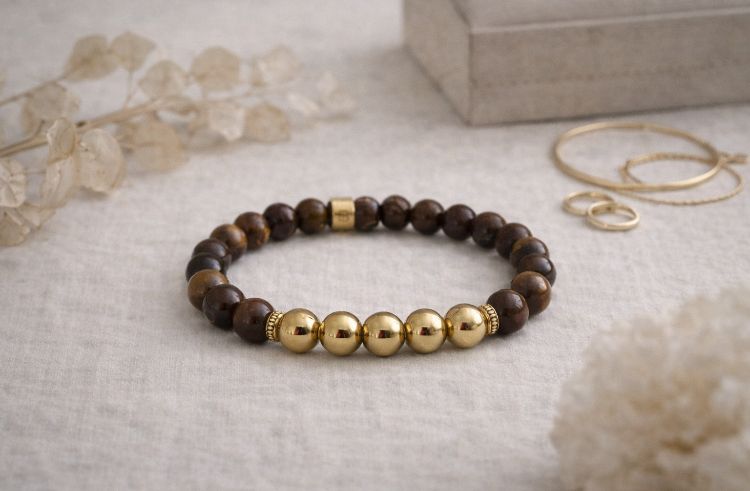 La combinación de hematita dorada y ojo de tigre crea una energía contenida y estable: una fuerza que no se impone, sino que sostiene y orienta desde el centro interior.