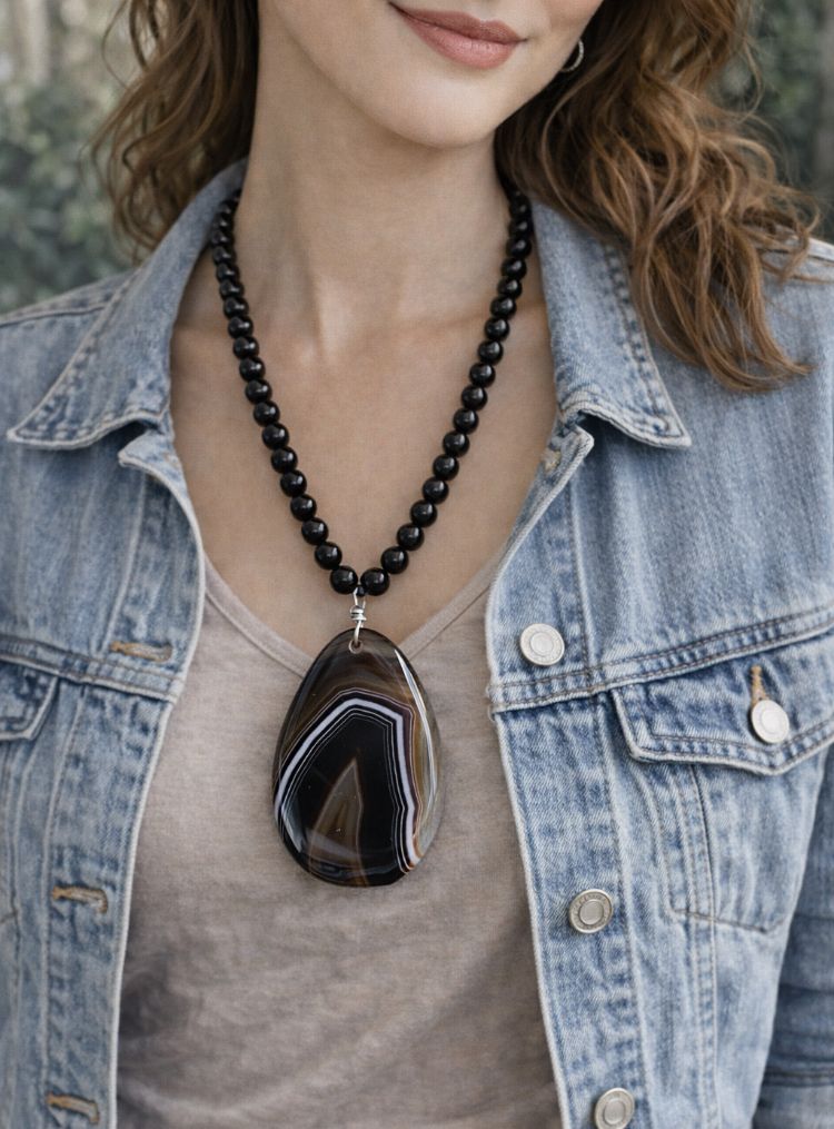 La gota central de ágata bandeada actúa como punto de enfoque y anclaje. Sus vetas naturales representan los distintos ciclos de la vida, recordando que cada experiencia forma capas de aprendizaje, resistencia y sabiduría interior.