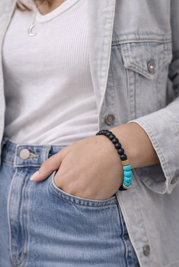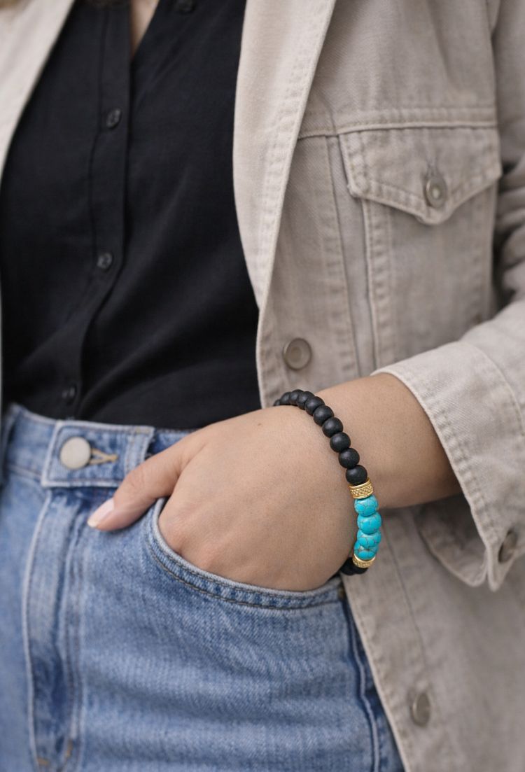 La combinación de turquesa y ónix simboliza equilibrio entre calma y fortaleza, ayudando a mantenerte centrada y resguardada ante cargas externas.