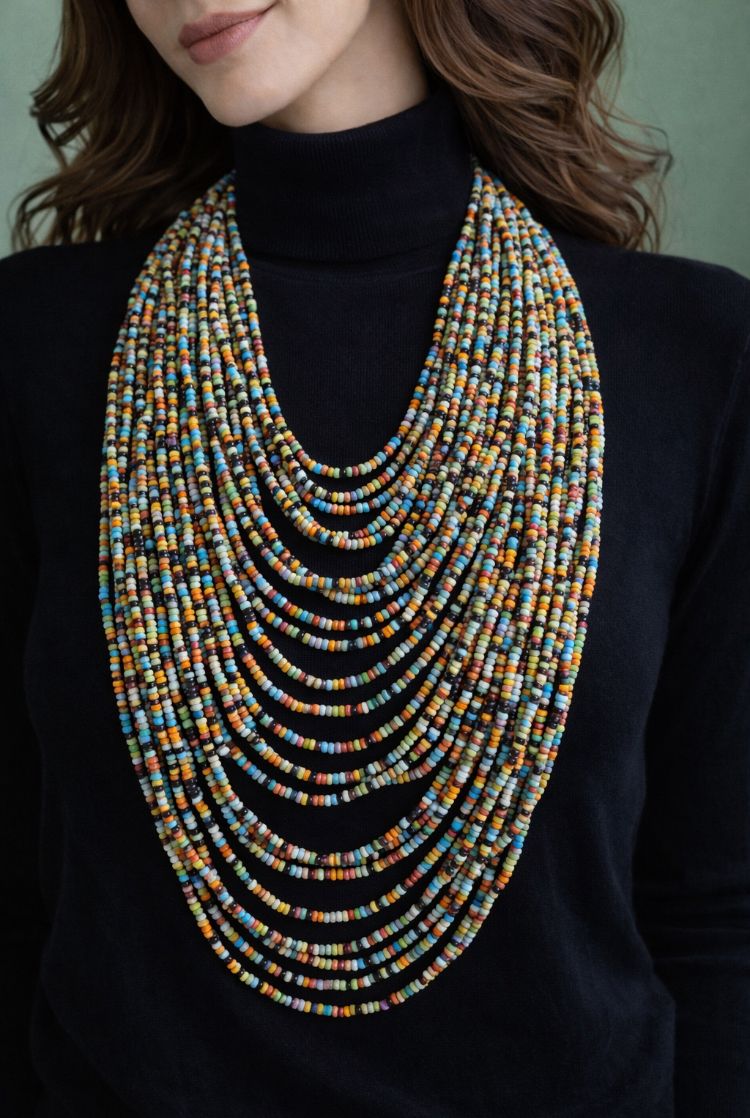 Cada cuenta ha sido cuidadosamente ensartada para formar una pieza dinámica y expresiva, ideal para mujeres que disfrutan destacar desde lo auténtico y lo artístico.