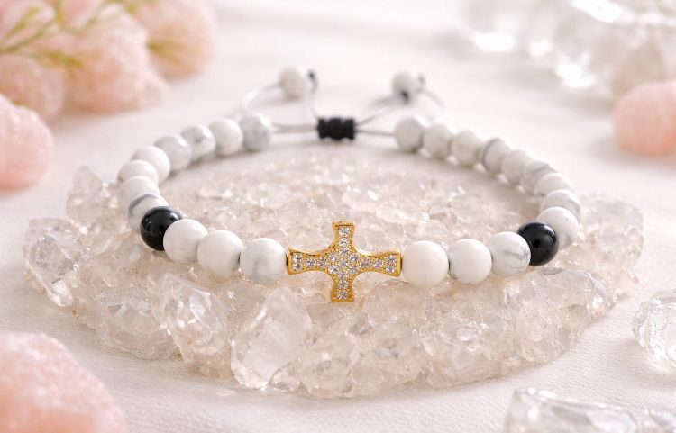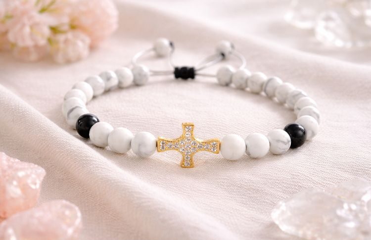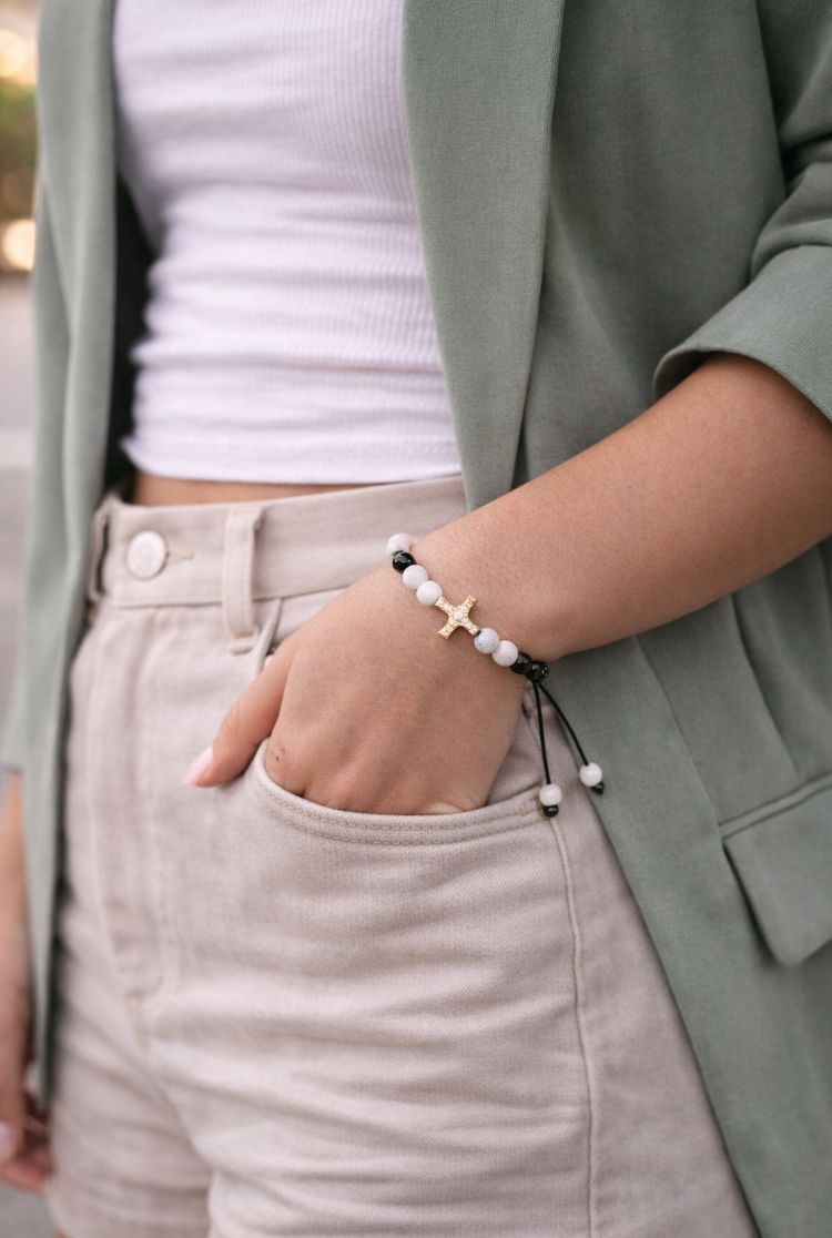 El ónix representa firmeza y contención, mientras que el jaspe blanco evoca calma, claridad y pureza de intención. La cruz actúa como símbolo de amparo y guía, acompañando desde la confianza y la serenidad.