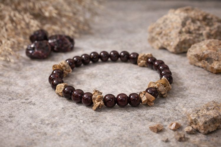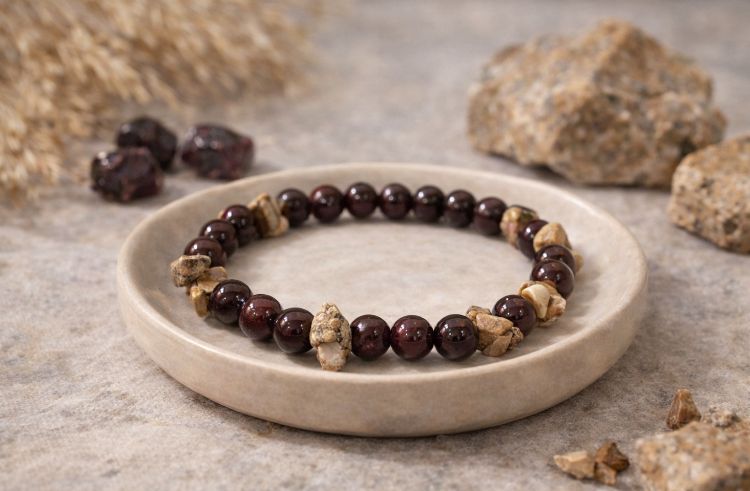 El granate —roca roja de energía profunda— simboliza vitalidad, arraigo y fuerza vital, mientras que el jaspe arenoso representa conexión con la tierra, equilibrio y sostén emocional.